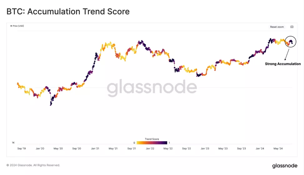 Подобное поведение отслеживается по метрике Accumulation Trend Score (ATS), оценивающей взвешенное изменение баланса на рынке. Показатель зафиксировал максимальное возможное значение 1,0, что говорит о существенном аккумулировании в течение последнего месяца.
