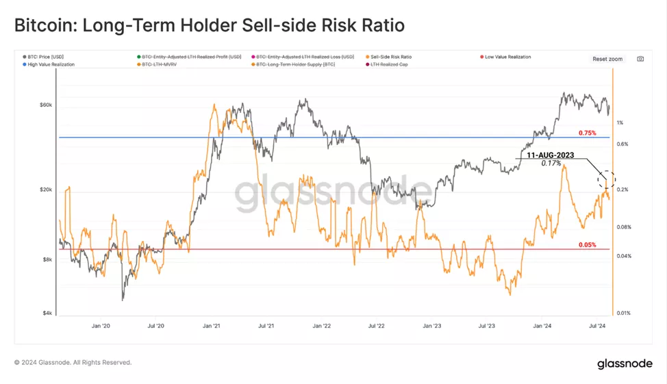 Коэффициент Sell-Side Risk применительно к долгосрочным инвесторам подтверждает предыдущее наблюдение. Индикатор остается на более низком уровне по сравнению с предыдущими прорывами ATH.