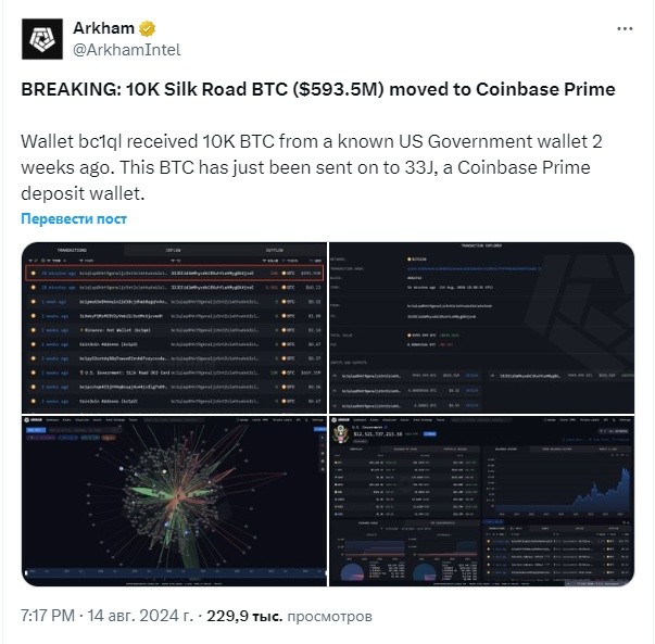 Адрес, который «получил 10 000 BTC из кошелька правительства США 2 недели назад… только что переправил монеты на… депозитарный кошелёк Coinbase Prime.