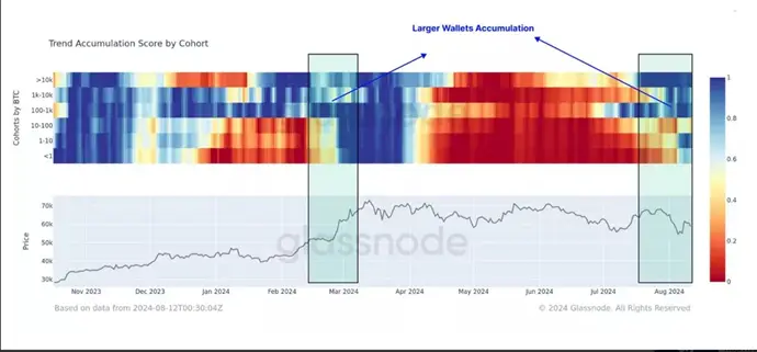 Ходлинг усилился среди владельцев крупных криптовалютных кошельков, говорят в Glassnode. На поведение указывает метрика Accumulation Trend Score (ATS), оценивающая изменение баланса на рынке. Индикатор зафиксировал максимальное возможное значение — 1,0.