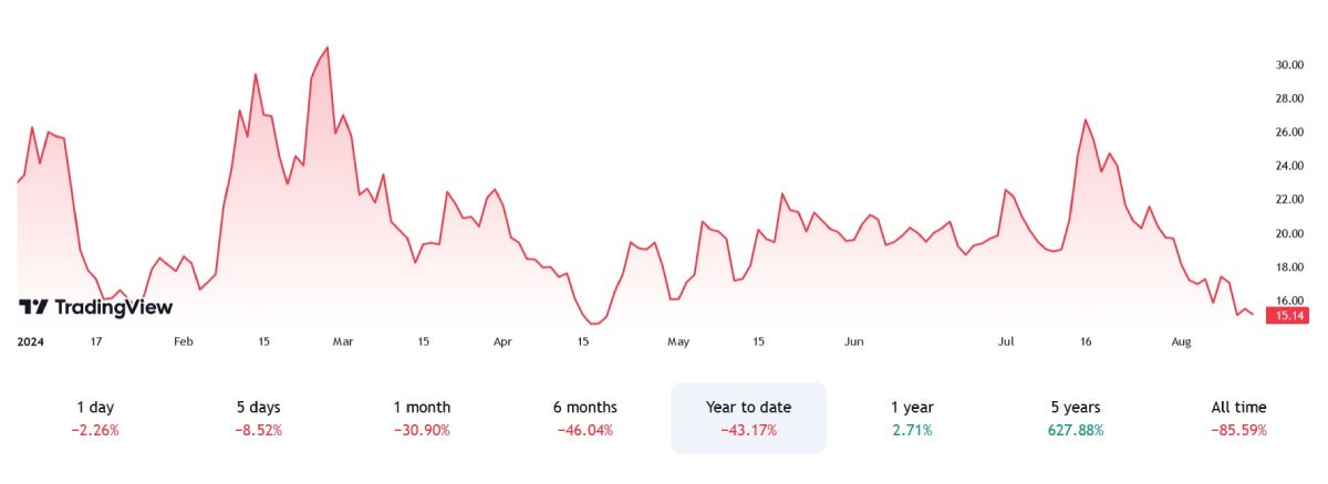 Однако участники фондового рынка не воодушевлены капиталовложениями в BTC, совершёнными Marathon Digital. С начала 2024 года акции предприятия подешевели на 43%, и на графике пока отсутствуют признаки разворота. Медвежий тренд обусловлен в первую очередь доходом майнера ниже прогнозируемого показателя.