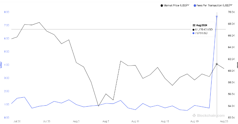 В четверг, 22 августа, средняя комиссия за транзакцию в биткоинах выросла на 937,7% с $0,74 до $7,679, в первую очередь из-за возросшего числа транзакций.