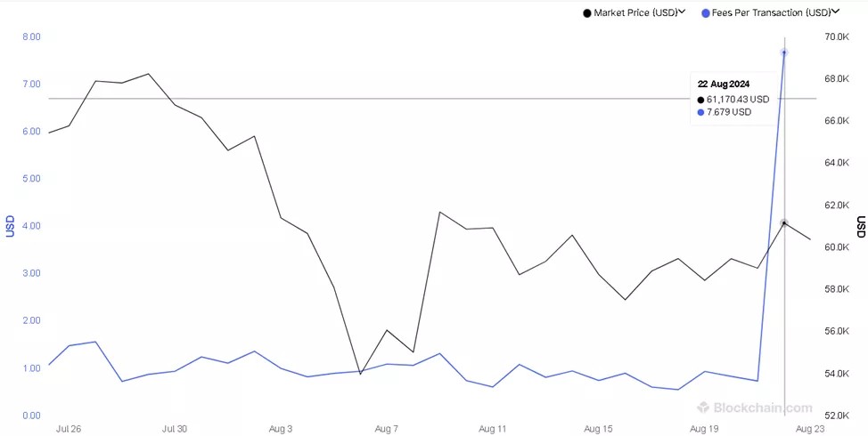 22 августа средняя комиссия за транзакцию в блокчейне биткоина подскочила сразу на 937,7% относительно предыдущего дня — с $0,74 до $7,68. Такие данные приводит Blockchain.com.