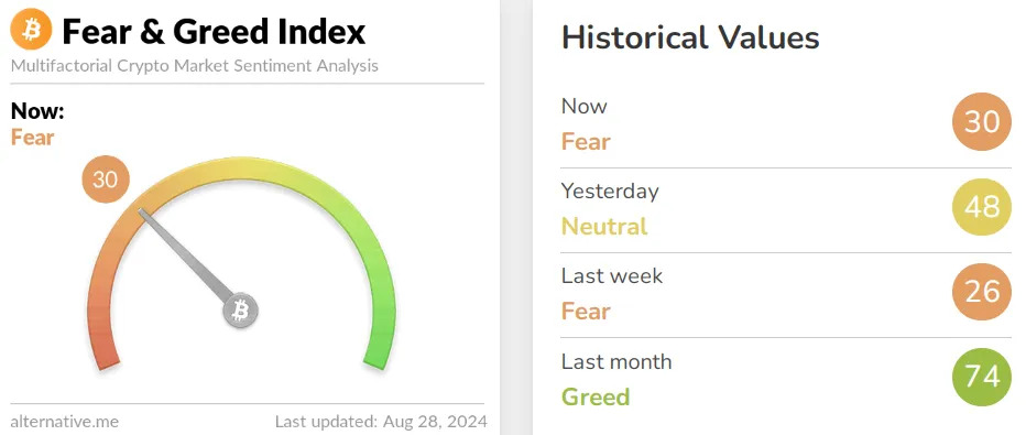 На фоне падения криптовалюты индекс страха и жадности ушел в красную зону, что говорит о неуверенности участников рынка в перспективах роста монеты в ближайшее время.