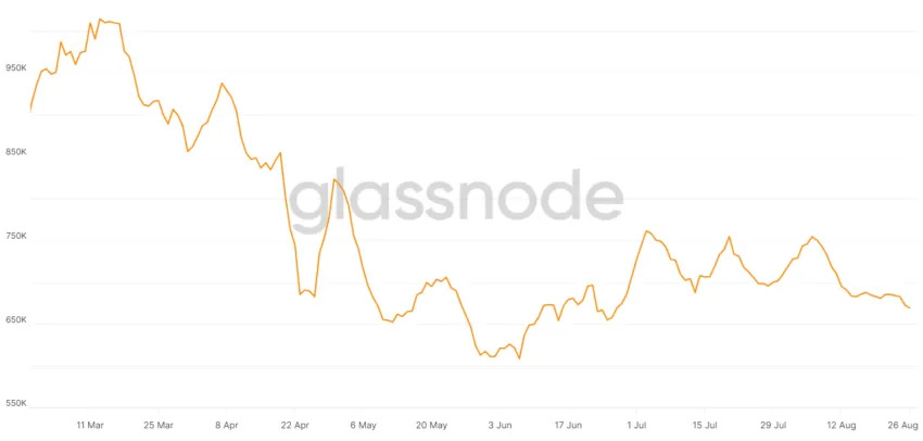 Кривая отражает среднее количество активных адресов в сети биткоина за 7 дней. Источник: Glassnode