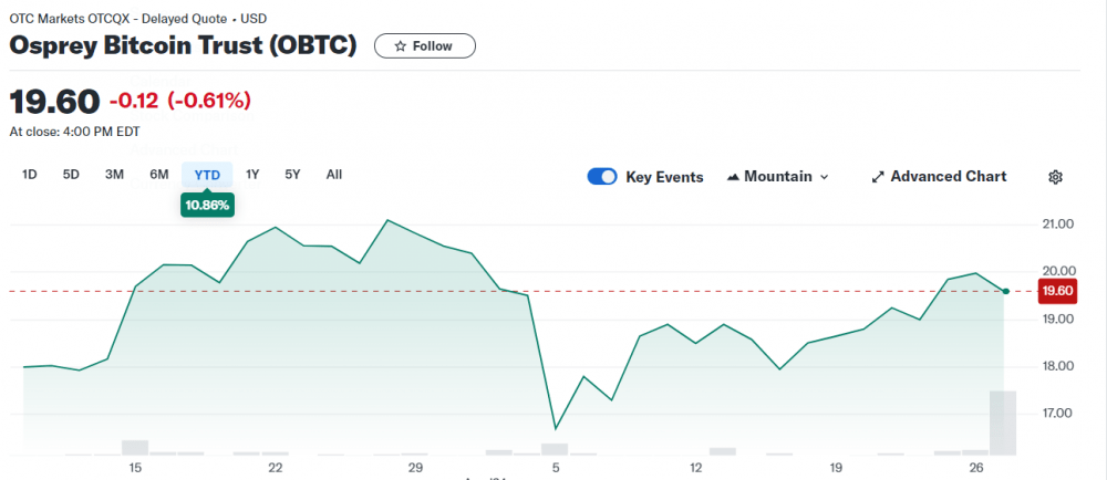 Годовая цена пая Osprey Bitcoin Trust (OBTC) Источник: Yahoo Finance