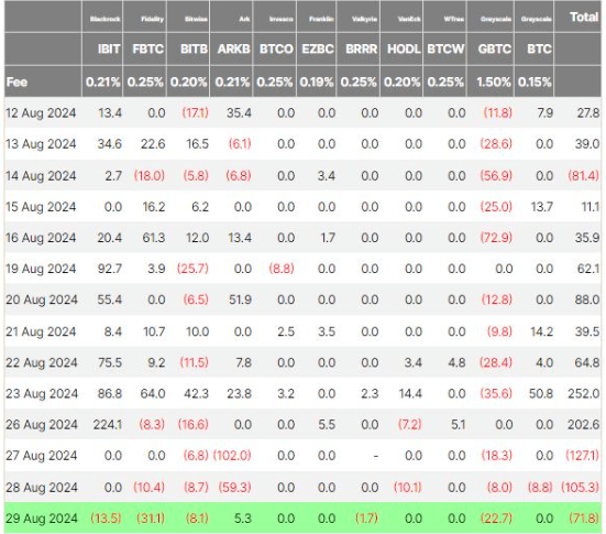 В совокупности из 11 американских спотовых биткоин-фондов инвесторы вывели около $71,8 млн, по данным на 29 августа. Больше всего средств потерял Fidelity Wise Origin (FBTC) – фонд лишился $31,1 млн. На втором месте – Grayscale Bitcoin Trust (GBTC) с $22,7 млн чистого оттока. Биткоин-фонд IBIT от BlackRock – на третьем месте по размеру потерь.