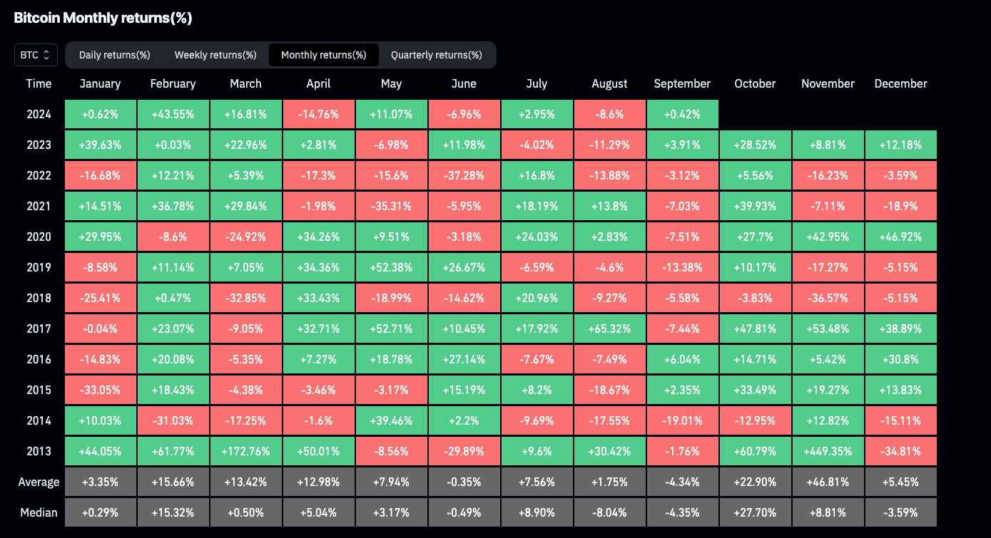 Сентябрь всегда был худшим месяцем для доходности биткоина. Источник: Coinglass.