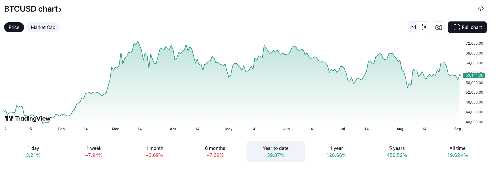 В настоящее время биткоин торгуется по $59 140 и показал рост на 40% с начала этого года. На момент публикации BTC остается на 20% ниже своего исторического максимума в $73 800, который он достиг 14 марта, согласно данным TradingView.