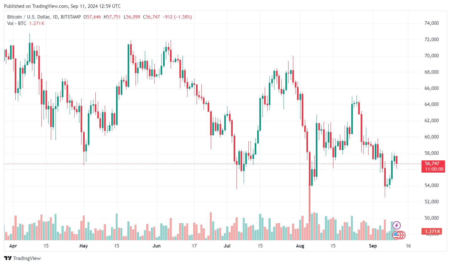 На публикацию отчета стоимость биткоина никак не отреагировала. На момент написания материала BTC торгуется по $56 747, подешевев за последние сутки на 0,6%.