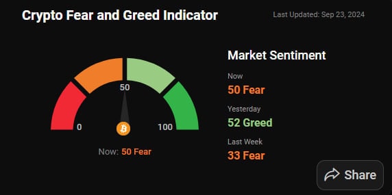 Индекс страха и жадности отметился падением. За сутки показатель уменьшился на два пункта — до 50.