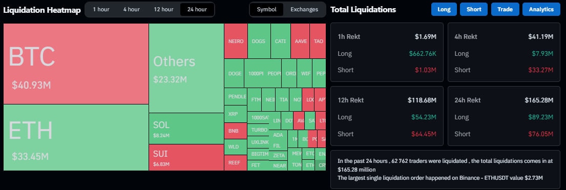 На фоне роста цен на криптоактивы объем ликвидаций по фьючерсным контрактам на крипторынке также увеличился. Показатель превысил $165 млн за сутки, по данным CoinGlass.