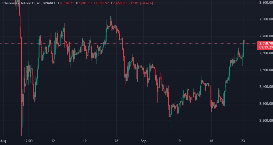 Монета Ethereum (ETH) торгуется вблизи отметки в $2660. За сутки актив вырос на почти 3%.