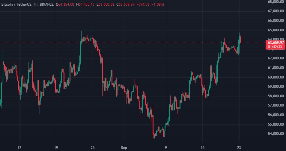 В ночь на 23 сентября 2024 года курс биткоина в моменте поднимался до отметки в $64 745. Позже цена первой криптовалюты откатилась до около $63 700. За последние 24 часа актив вырос на 1%.