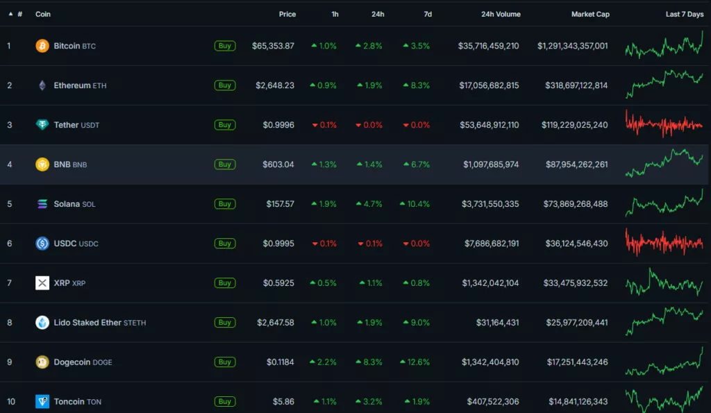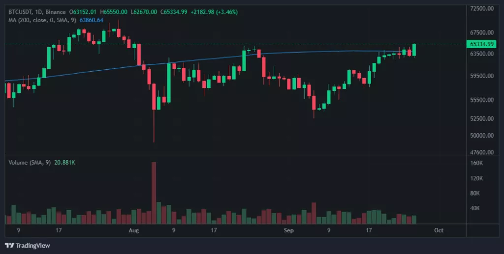 Биткоин продолжил рост — впервые с начала августа цена актива превысила отметку $65 000.