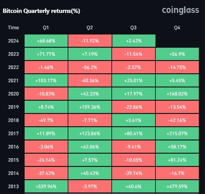 Так, после халвинга в 2020 году биткоин вырос на 168% в IV квартале, по данным CoinGlass:
