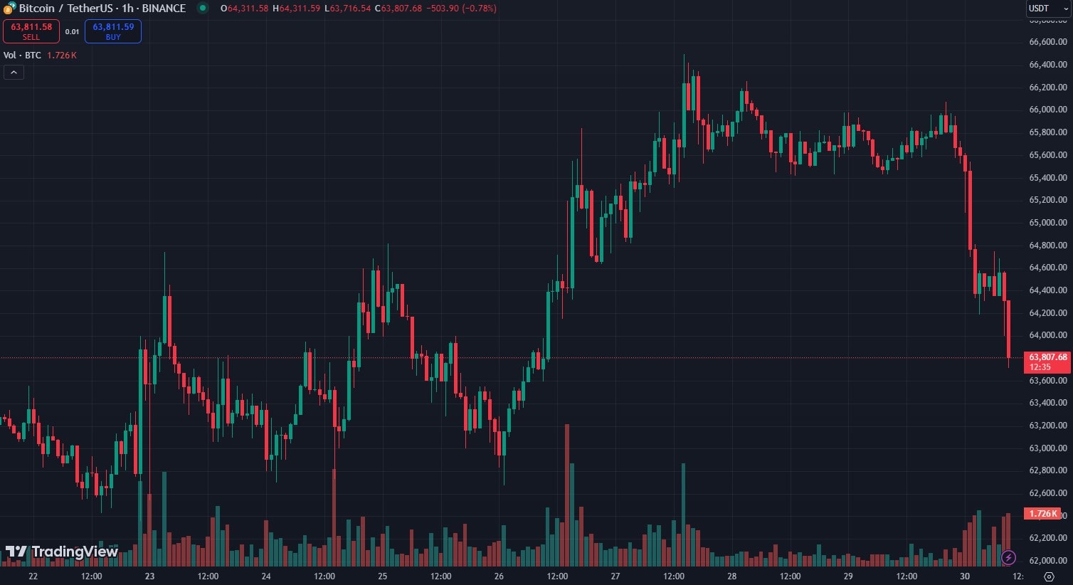 На момент публикации биткоин торгуется вблизи $63 800, по данным TradingView. За последние сутки цена актива упала на более чем 3%.