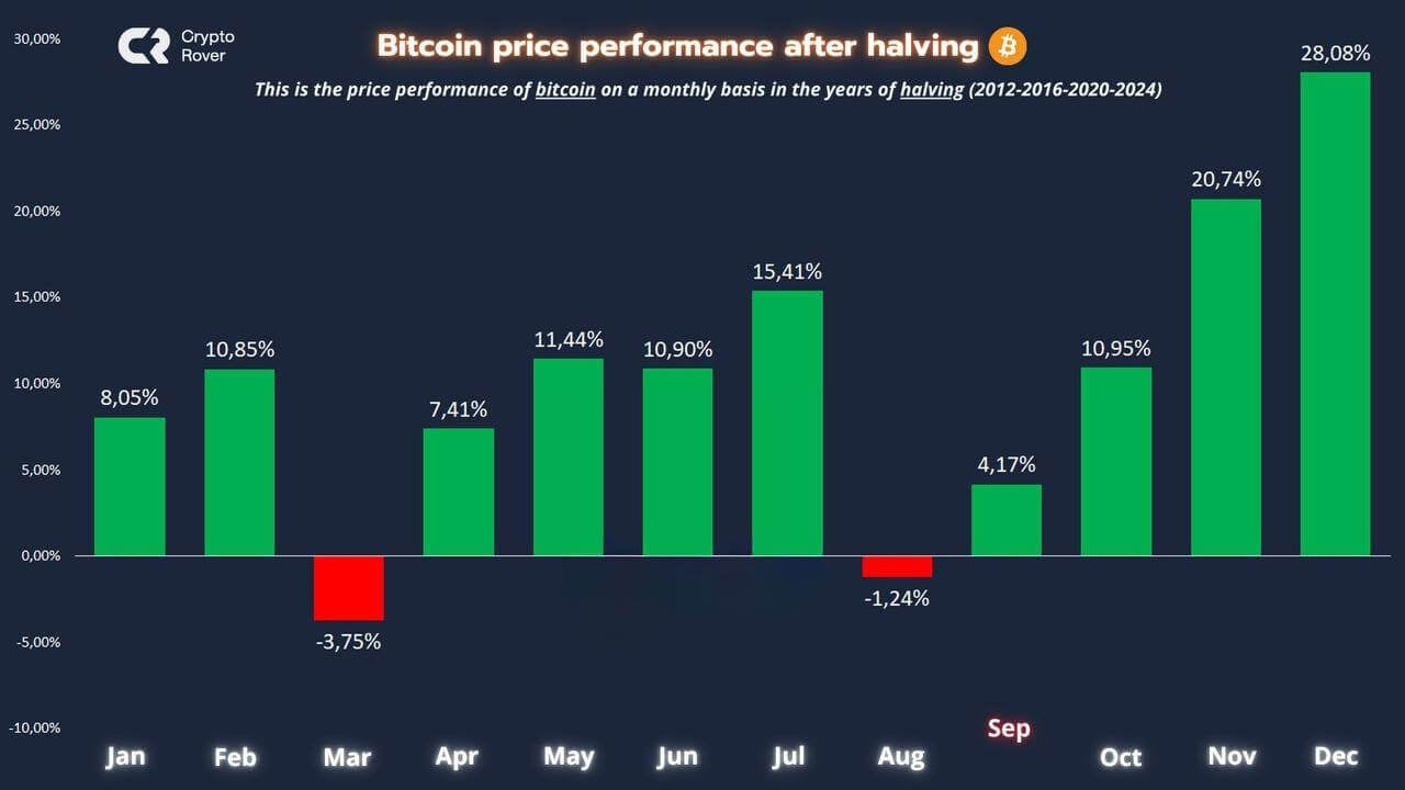 На следующем графике показаны изменения стоимости BTC после проведения халвингов. Как можно заметить, окончание года в ретроспективе действительно оказывается наиболее прибыльным, поскольку в ноябре и декабре первая криптовалюта в среднем растёт на 20 и 28 процентов соответственно.