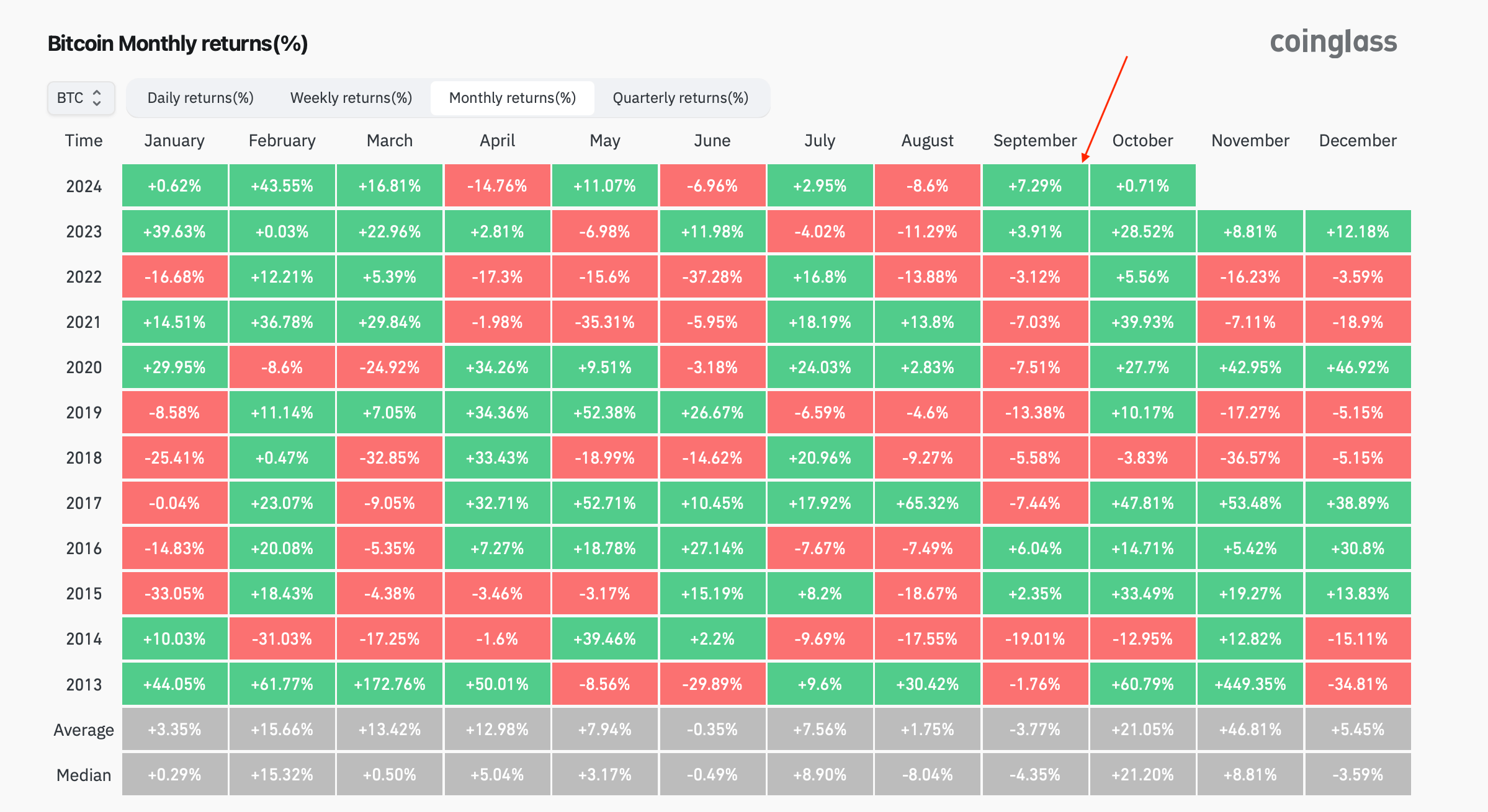 В отличие от сентября, с 2013 года было всего два октябрьских месяца, когда BTC заканчивал месяц в минусе, сообщает Coindesk. При этом его рост достигал 60 процентов, тогда как средний показатель был равен 22 процентам.