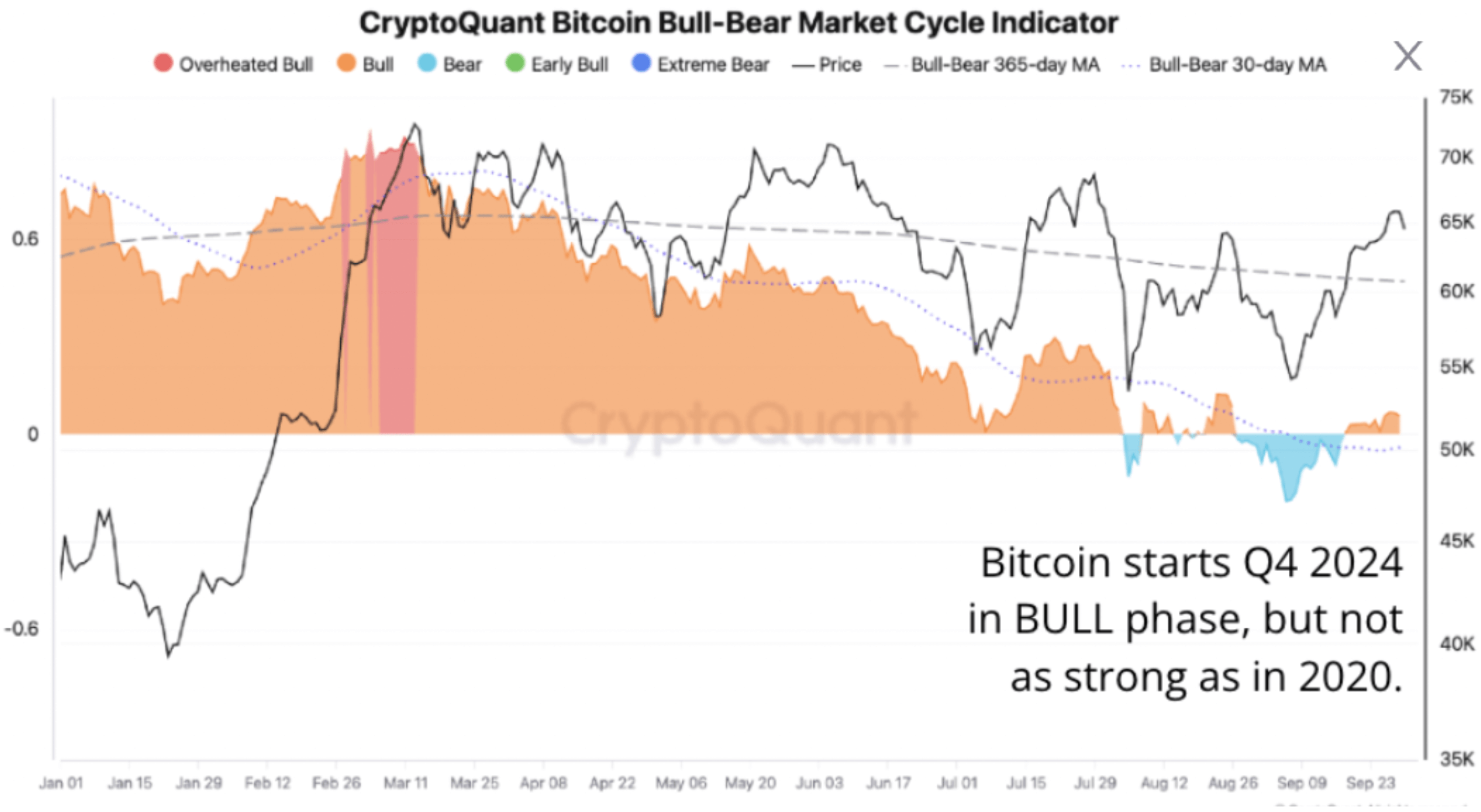 Так называемый индикатор рыночного цикла Bull-Bear от CryptoQuant показывает, что в период с марта по август 2024 года Биткоин оставался в бычьей фазе, которую обозначает оранжевая область.