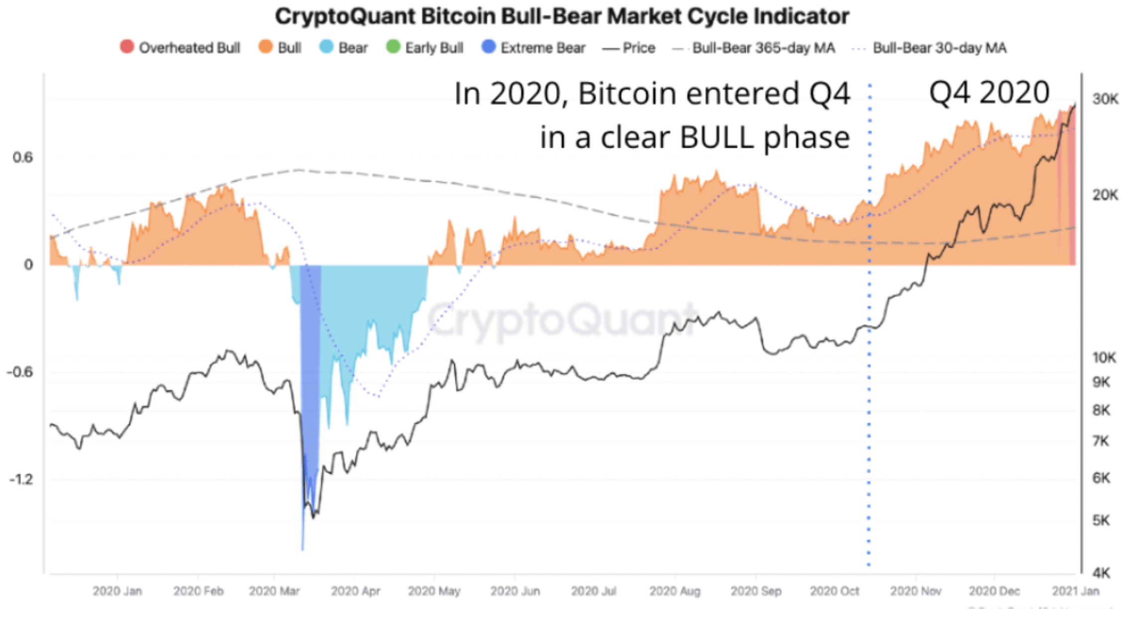 Для сравнения: Биткоин вошёл в четвёртый квартал 2020 года в очевидной бычьей фазе, что делает вход в последний квартал этого года относительно слабым.