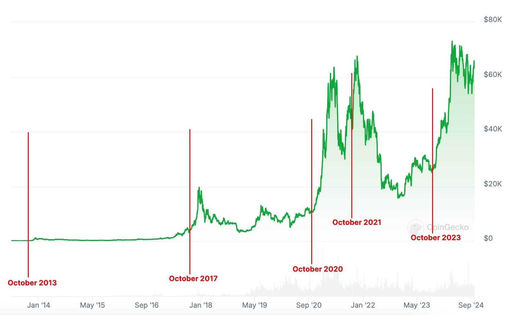 Обычно Биткоин демонстрирует хорошие показатели по доходности в октябре — и особенно при нахождении в бычьем тренде. При этом как накануне напомнили аналитики Lookonchain, предыдущие пять буллранов в криптоиндустрии стартовали как раз в этом месяце. Так что инвесторы сохраняют позитивные настроения в отношении перспектив ближайших недель на рынке.