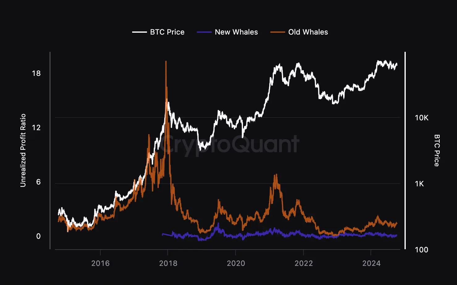 У китов постарше дела обстоят лучше. Их коэффициент нереализованной прибыли на 30 сентября достиг примерно 1.27 пункта, в то время как у новых китов показатель находится на уровне 0.01 пункта. Однако Чжу отметил, что старые киты «не видели особенно высоких доходов» во время нынешнего цикла.