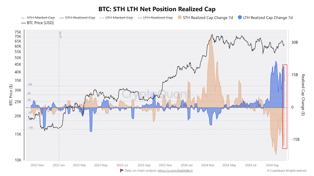 Долгосрочные держатели биткоина, знаменитые своими «алмазными руками», похоже, начали поддаваться искушению зафиксировать прибыль. По данным CryptoQuant, за прошлую неделю объем реализованной капитализации в их руках сократился на $6 млрд — с $19 млрд до $12 млрд.