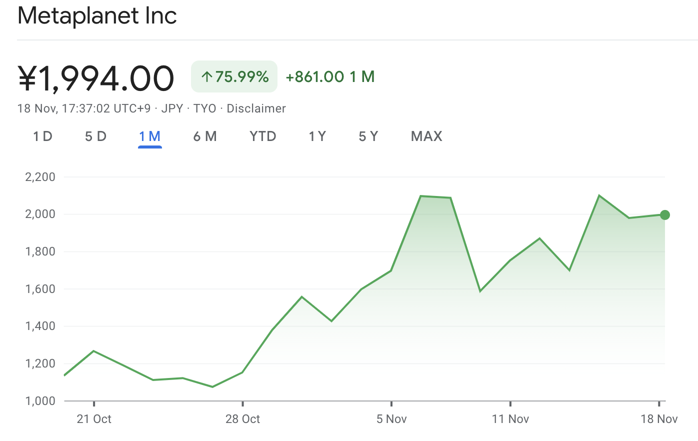 Акции Metaplanet продемонстрировали уверенный рост на 0,81% до 1 994 иен 18 ноября на торгах в Японии. Особенно впечатляющим выглядит увеличение стоимости акций компании с начала года — на 1 146%, согласно данным Google Finance. Такая динамика особенно примечательна на фоне общего снижения индекса Nikkei 225, который потерял сегодня 1,09%.