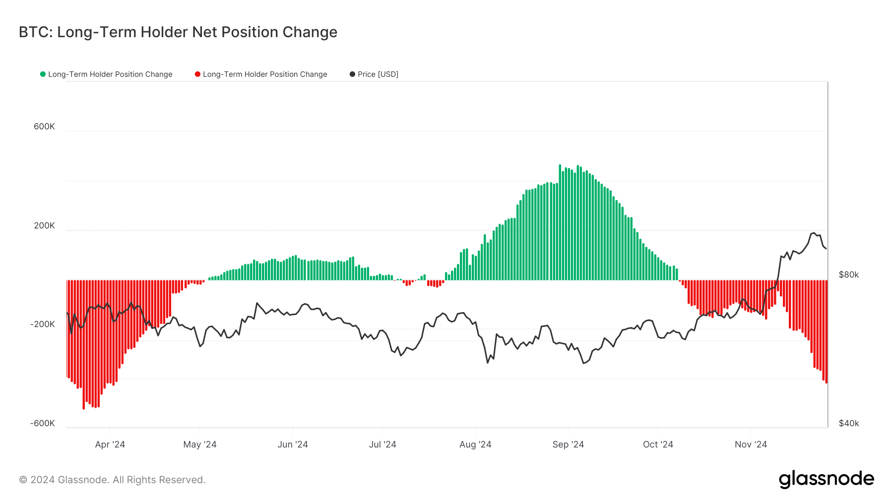 Ранее мы освещали отчет экспертов Glassnode, в котором они подробно разобрали причины биткоин-ралли во второй половине ноября 2024 года. Согласно ему, постоянно высокое давление продаж со стороны долгосрочных держателей поглощалось инвесторами в акции спотовых ETF на базе актива.