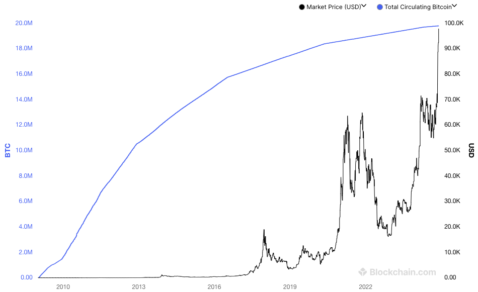 По состоянию на 27 ноября в обороте находилось 19,8 млн BTC, и осталось добыть 1,2 млн BTC, пока не будет достигнуто ограниченное предложение в 21 млн монет.