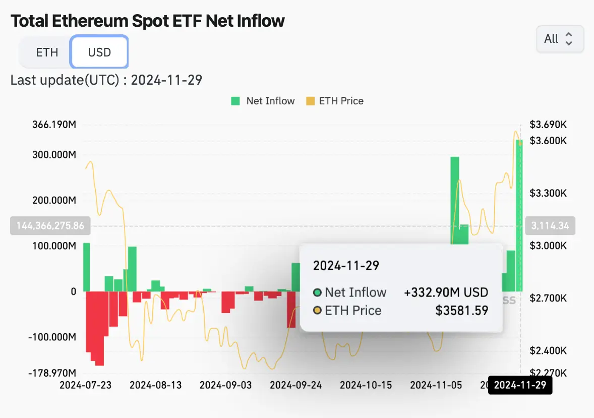 Хорошие инвестиционные возможности также могут скрываться в альткоинах – по крайней мере, на это указывает ротация средств в спотовые Эфириум-ETF. Они достигли нового суточного рекорда по притоку в размере 332.9 миллиона долларов по итогам пятницы.