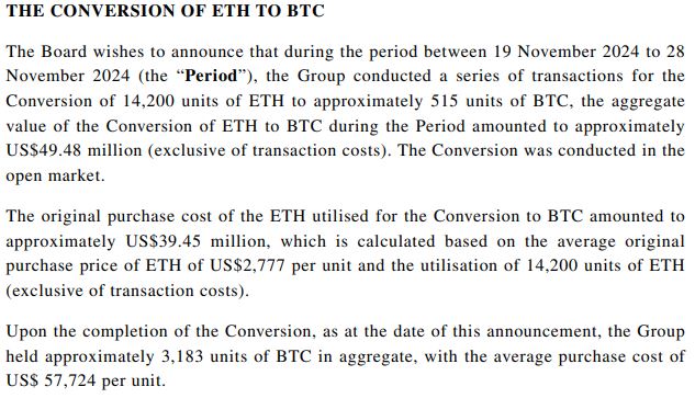 «Основываясь на соображениях о будущих перспективах BTC и ETH и стратегическом плане Компании, Совет считает, что сейчас для Группы относительно подходящее время для конвертации ETH, удерживаемых Группой, в BTC для расширения резервов BTC», — добавлено в сообщении.