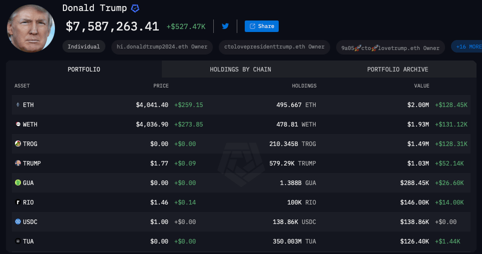 Криптовалюты на Эфириум-кошельке новоизбранного президента США Дональда Трампа