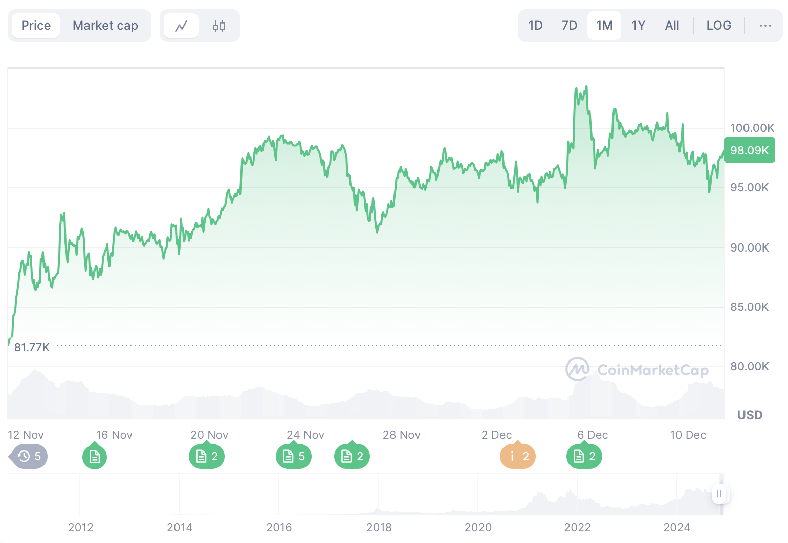 В начале декабря биткоин впервые в истории преодолел уровень $100 000. Курс BTC поднялся до рекордных $103 900.