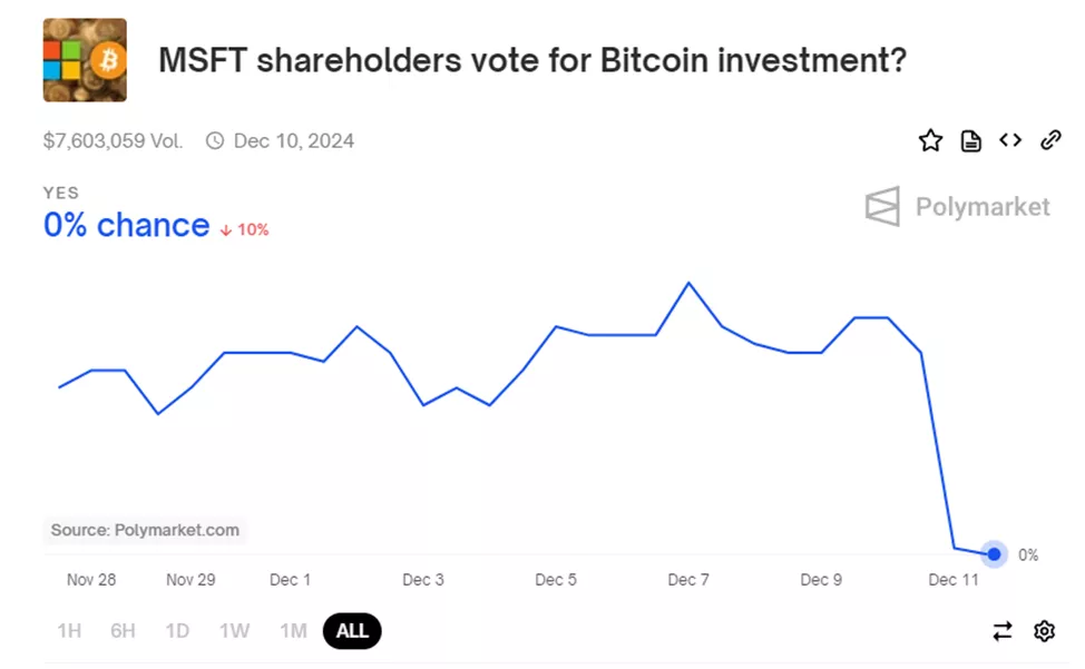 Предложение The National Center for Public Policy Research (NCPPR) направить 1% активов на покупку первой криптовалюты поддержало лишь 0,55% держателей акций Microsoft.