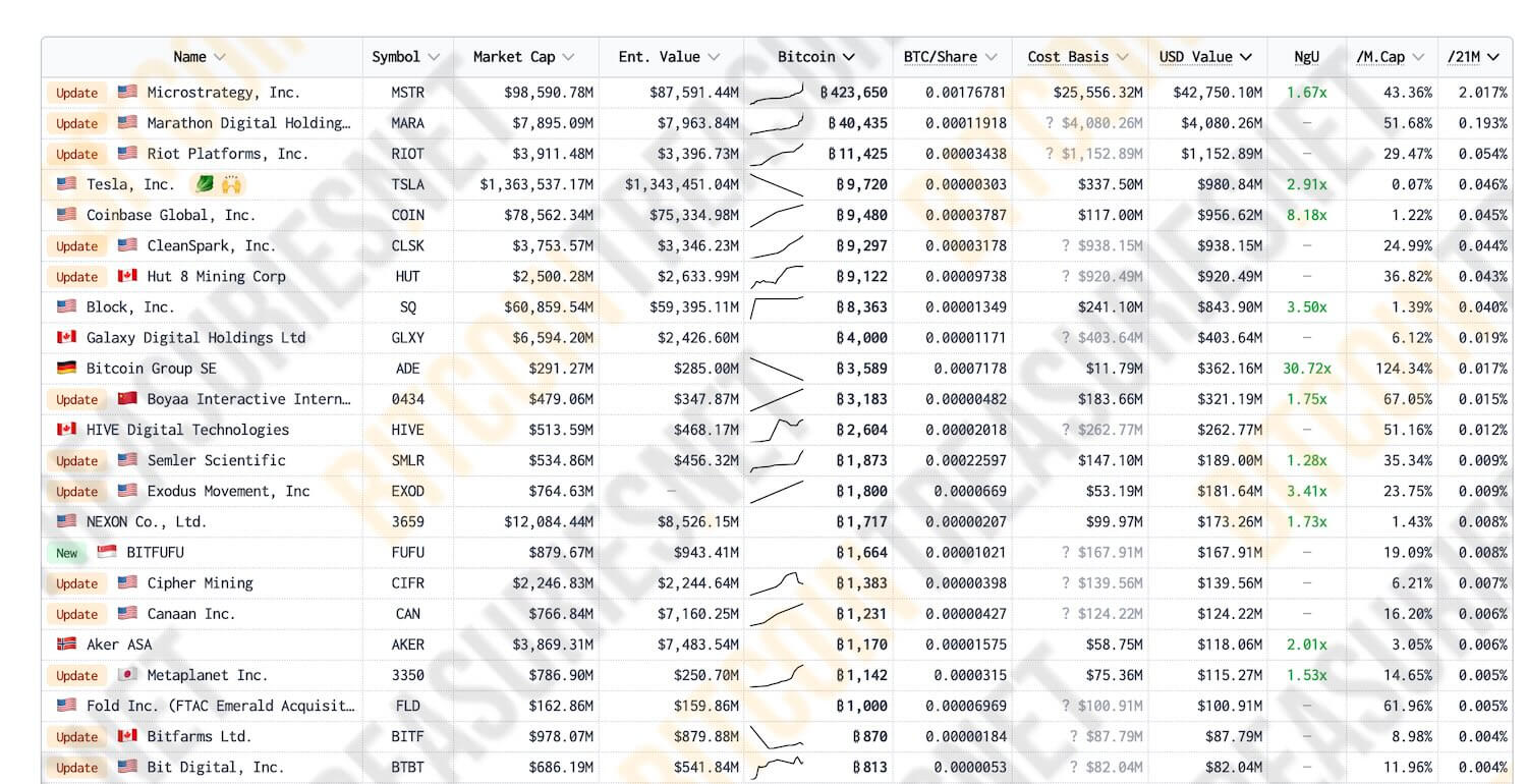 Рейтинг публичных компаний по числу накопленных биткоинов