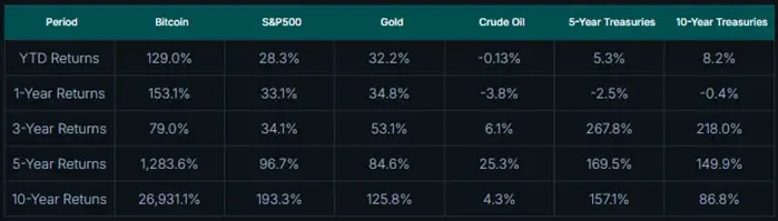 «Этот десятилетний обзор показывает, что биткоин является самым выгодным активом с высокими темпами роста, тогда как золото, облигации и акции являются более безопасными альтернативами с меньшей доходностью для инвесторов, которые не склонны к риску», — говорится в отчете.