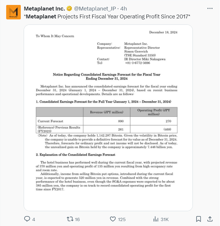 16 декабря Metaplanet объявила о четвертом выпуске облигаций на сумму чуть менее 4,5 млрд японских иен (30 млн долларов США) с целью накопления большего количества биткоинов, а также о плане выпустить очередную партию частных обычных облигаций на 5 млрд японских иен.