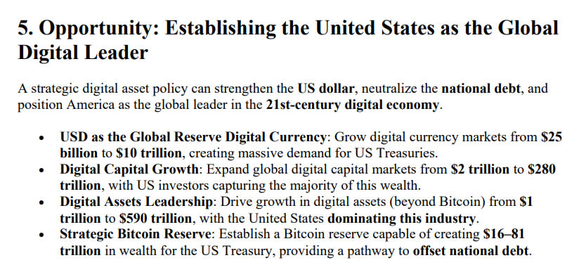 Наконец, криптофреймворк направлен на то, чтобы помочь позиционировать доллар США как мировую резервную цифровую валюту. Он также направлен на расширение мировых рынков цифрового капитала с двух до 280 триллионов долларов, «при этом инвесторы США получат большую часть этого богатства».