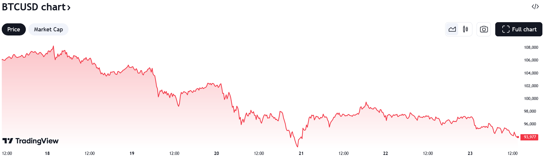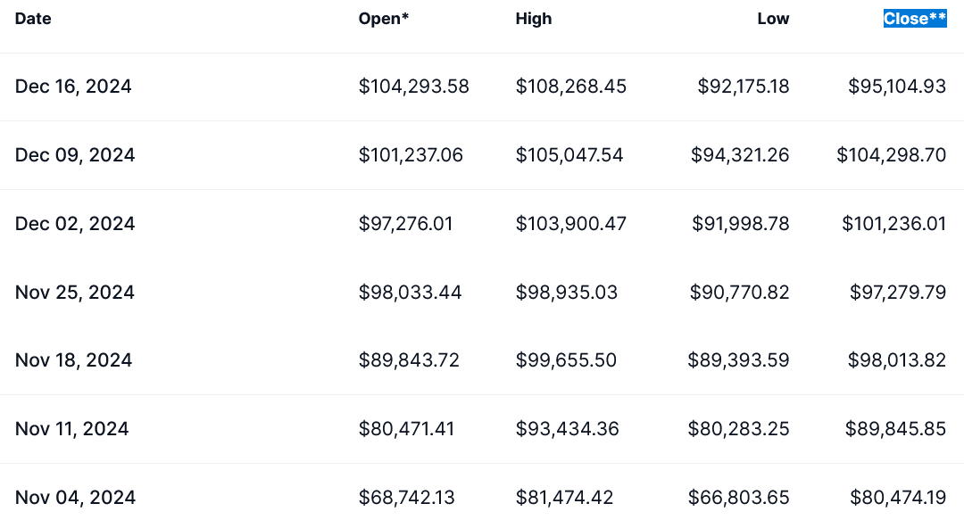 Биткоин упал на 10% за неделю, закончившуюся 22 декабря, и закрылся на отметке $94 645, что примерно на $10 500 меньше его начальной точки в $105 185, согласно TradingView.