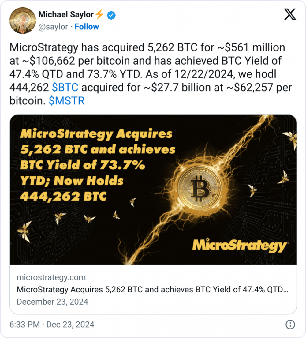 MicroStrategy приобрела 5262 BTC в период с 16 по 22 декабря, вложив в актив около $561 млн, о чем фирма официально объявила 23 декабря.