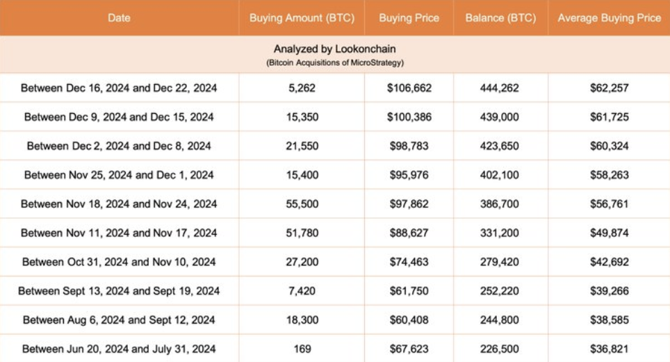 По состоянию на 22 декабря 2024 года MicroStrategy и ее дочерние компании в общей сложности владели приблизительно 444 262 BTC, приобретенными по совокупной цене покупки $27,7 млрд и средней цене покупки $62 257 за BTC.