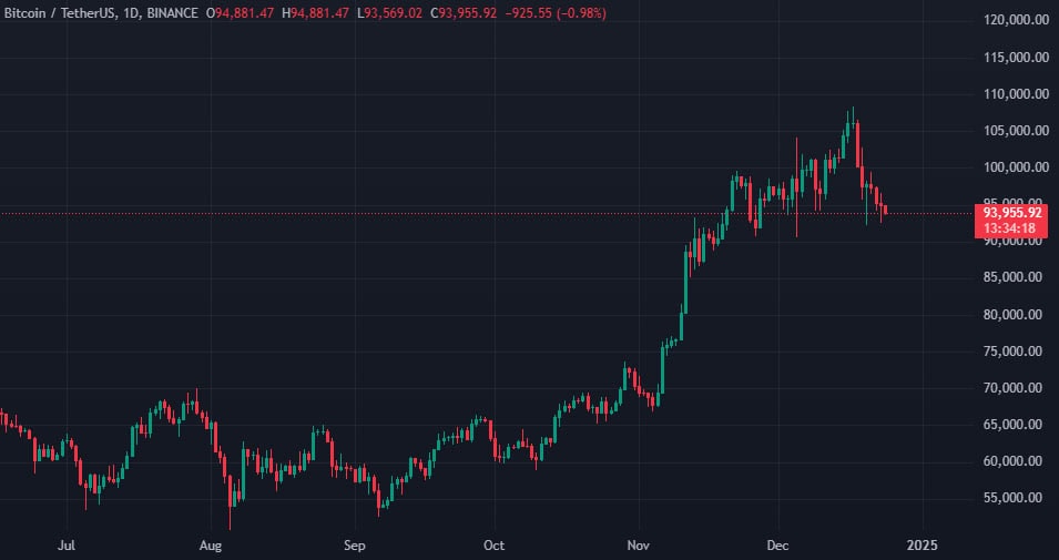 Отметим, 16 декабря первая криптовалюта росла выше отметки в $108 000, однако по состоянию на момент написания актив торгуется вблизи отметки в $94 000: