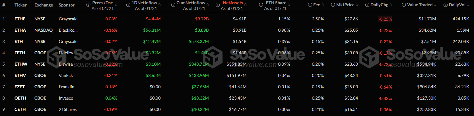 В секторе спотовых Ethereum-ETF пять продуктов отметились положительной динамикой, еще один — отрицательной. Последний — это фонд от компании Grayscale Investments, у которого было всего два торговых дня с притоком капитала с момента выхода этой категории продуктов на рынок.