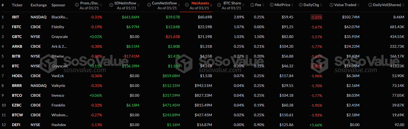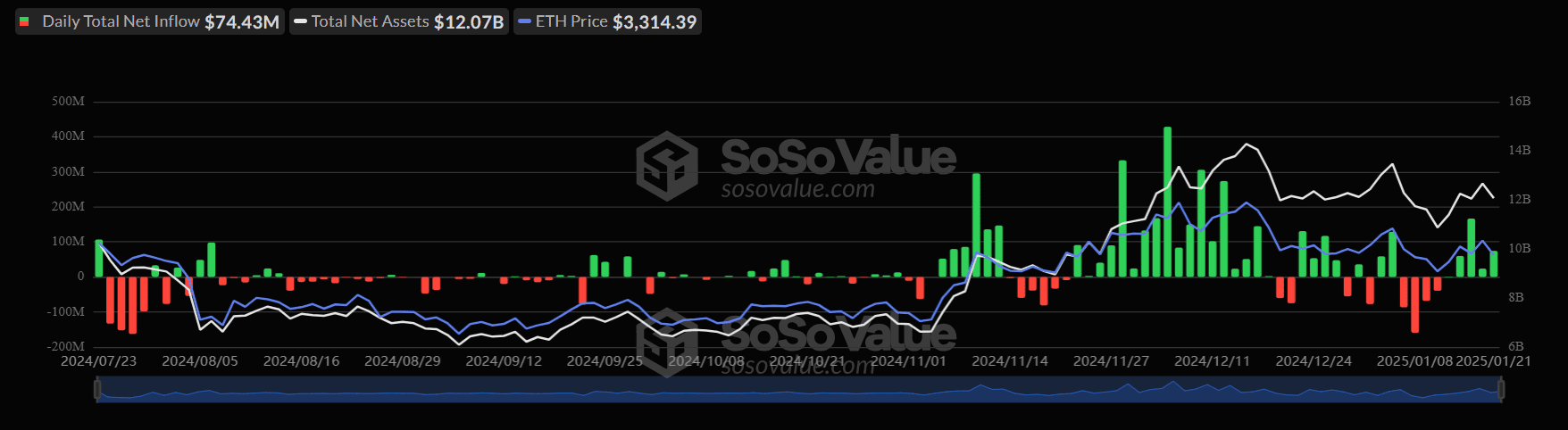 - 21 января чистый суточный приток капитала в спотовые биткоин-ETF составил более $802 млн, в спотовые Ethereum-ETF — свыше $74 млн.