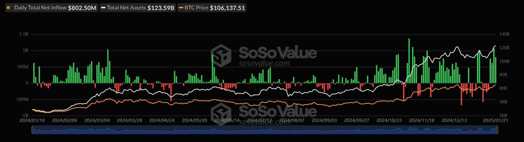Торговый день 21 января 2025 года оба сектора спотовых криптофондов в США закрыли с положительным показателем. Чистый суточный приток капитала составил $802,5 млн и $74,43 млн соответственно, согласно SoSoValue.