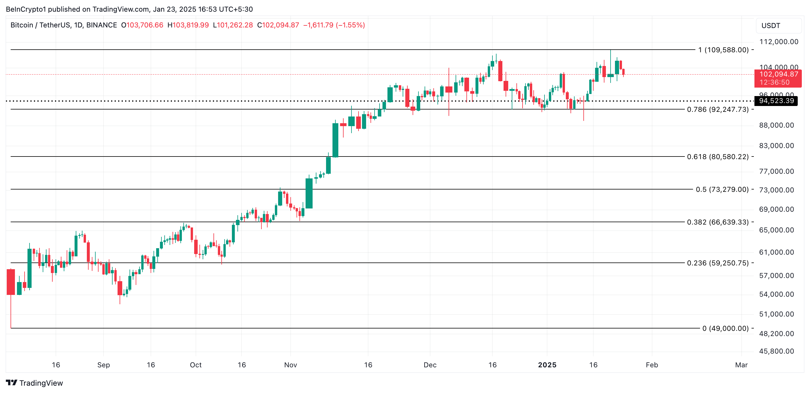 Без значительного участия мелких инвесторов рынок биткоина может не получать необходимой поддержки для сохранения восходящего импульса. Если эти держатели продолжат продавать, цена может упасть до $94 523.