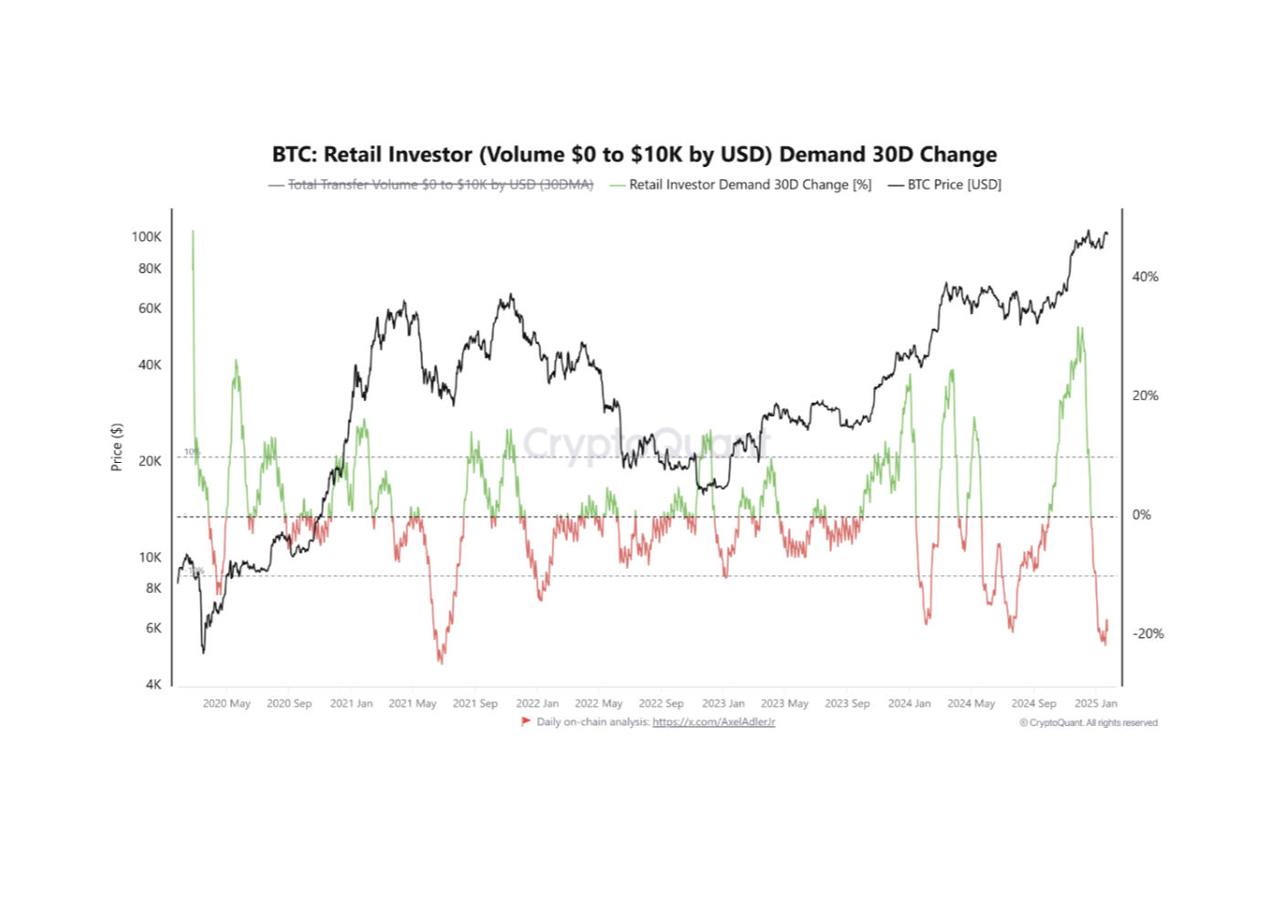 Биткоин (BTC) недавно достиг нового исторического максимума (ATH) на $109 588, но затем его цена упала. Частично это произошло из-за снижения активности розничных трейдеров