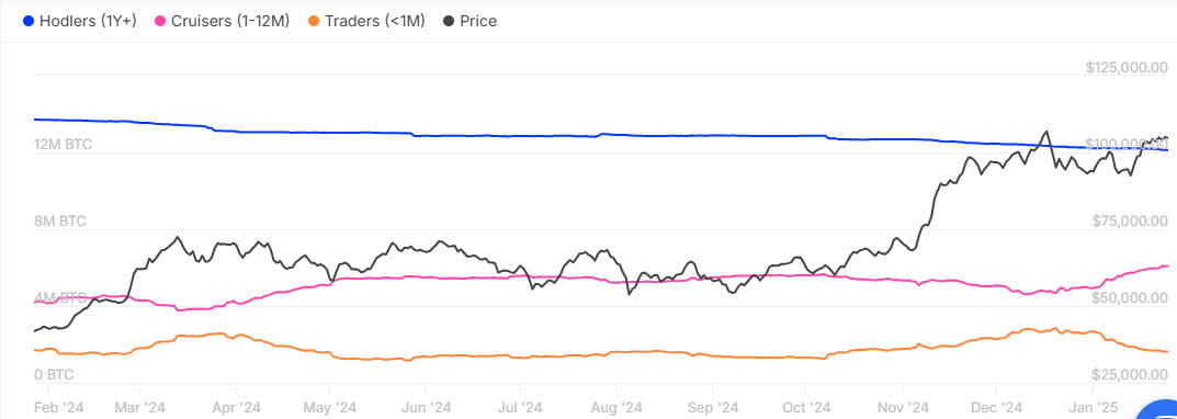 Вышеупомянутый сдвиг очевиден в распределении биткоинов по времени владения. Владельцев биткоинов можно разделить на три категории: холдеры, круизеры и трейдеры. Холдеры — это те, кто владеет биткоинами дольше, обычно более года.